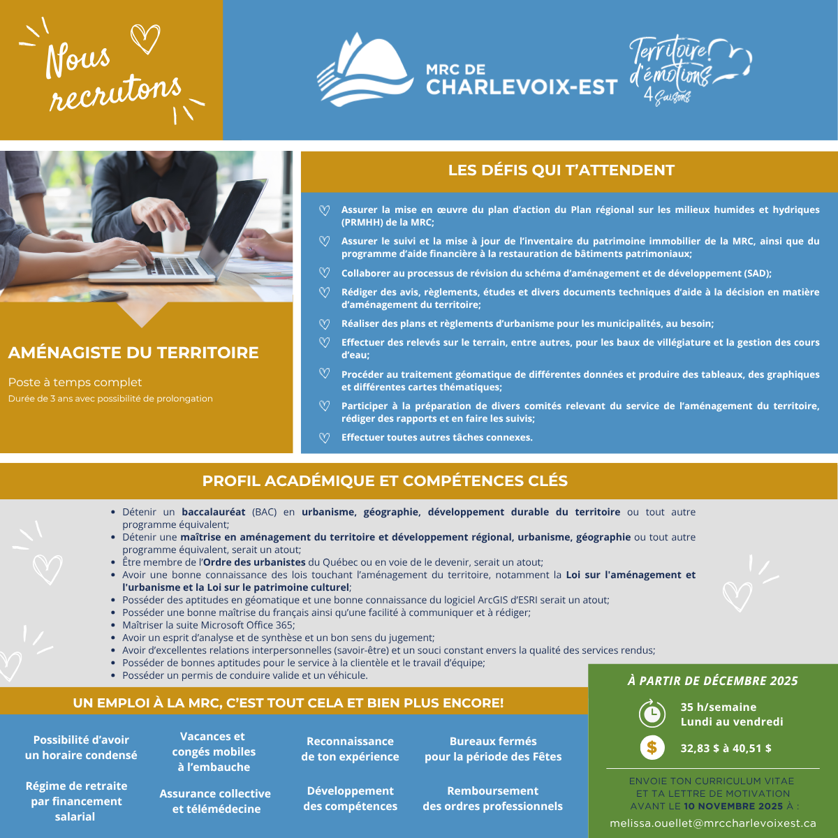 Les MRC de Charlevoix et de Charlevoix-Est sont heureuses de convier la population au Forum régional sur l’immigration dans Charlevoix (FRIC) 2025 sous la thématique « (Im)migration et territoire : des récits qui transforment ». Le forum, qui se tiendra le jeudi 6 novembre prochain de 8 h à 16 h au pavillon Joseph-Rouleau du Domaine Forget, est réalisé grâce au soutien financier du gouvernement du Québec et de la SADC de Charlevoix, ainsi qu’avec la participation du ministère de l’Immigration, de la Francisation et de l’Intégration et du ministère de l’Emploi et de la Solidarité sociale.